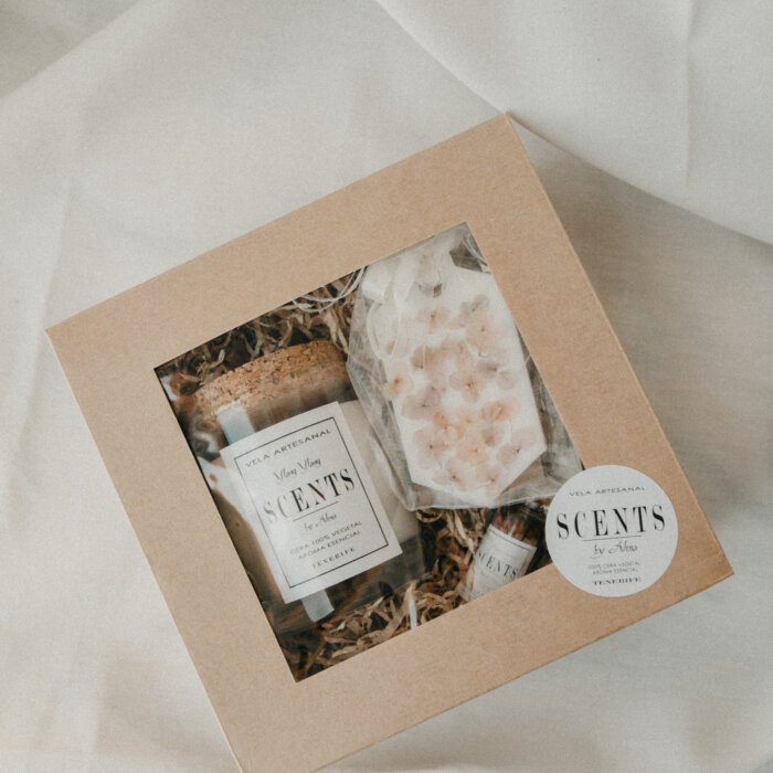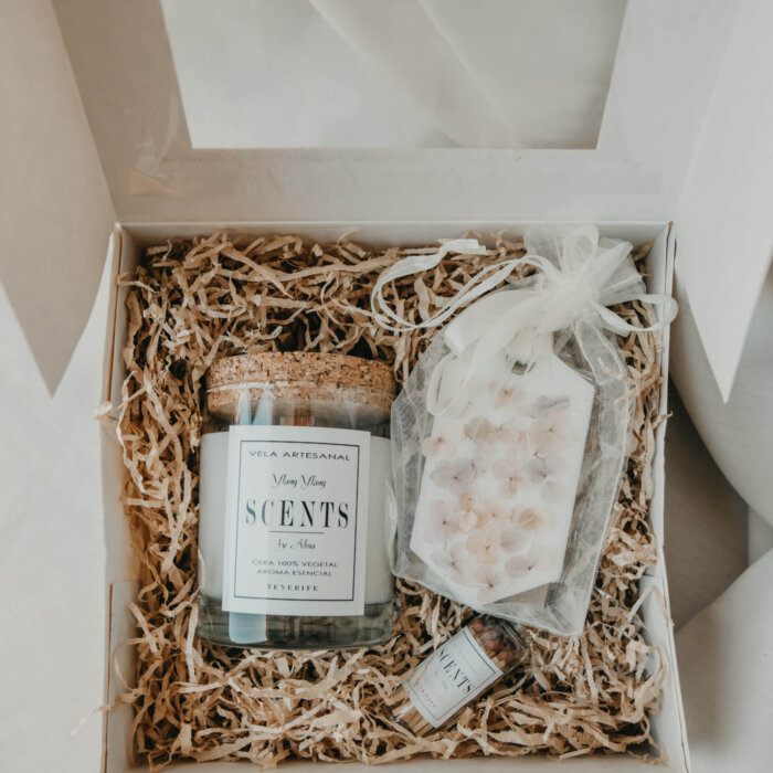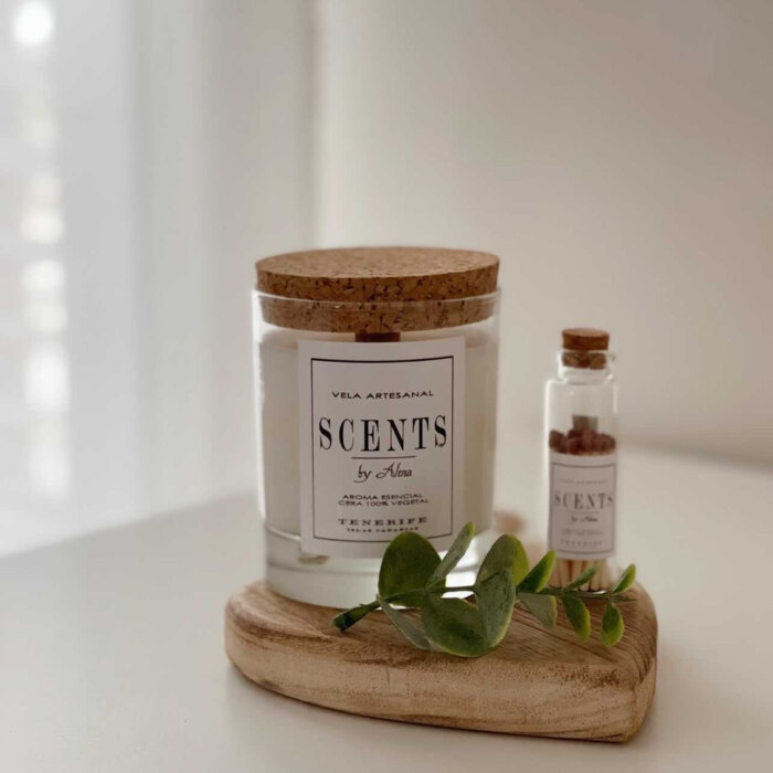 Un set con 1 vela mediana de 150 ml de cera de soja con la tapa de corcho, 1 aromatizador de cera de soja, las cerillas y la chocolatina para endulzar el Momento vela.