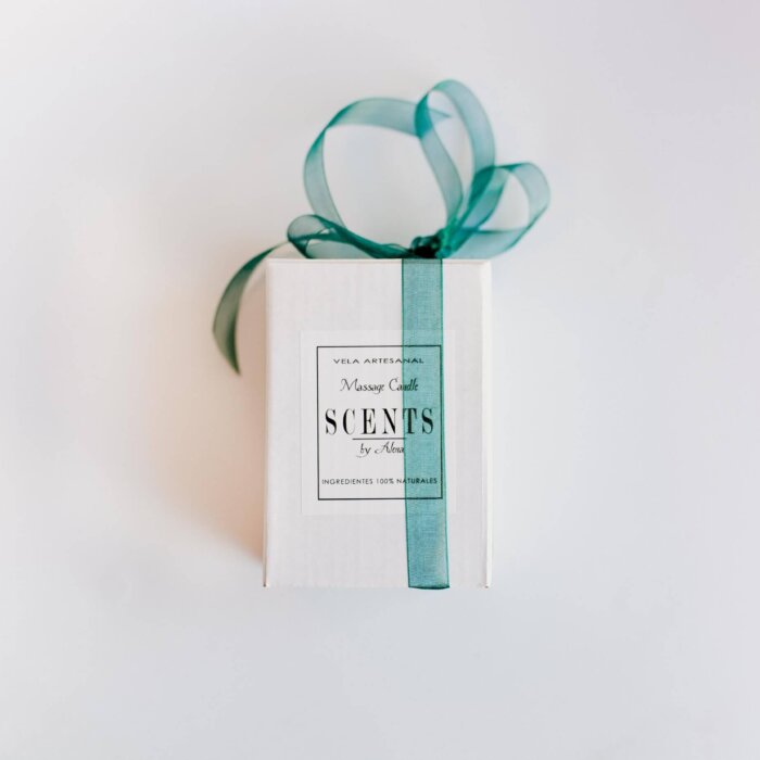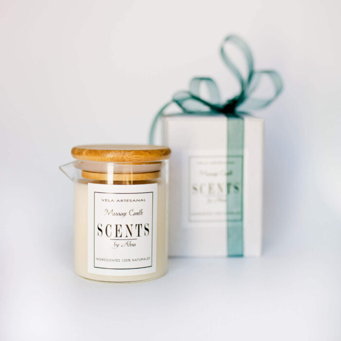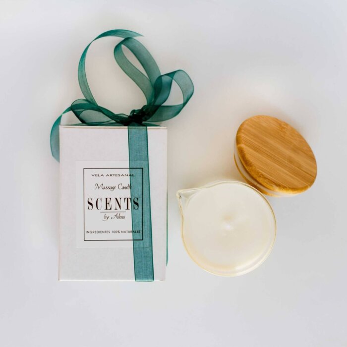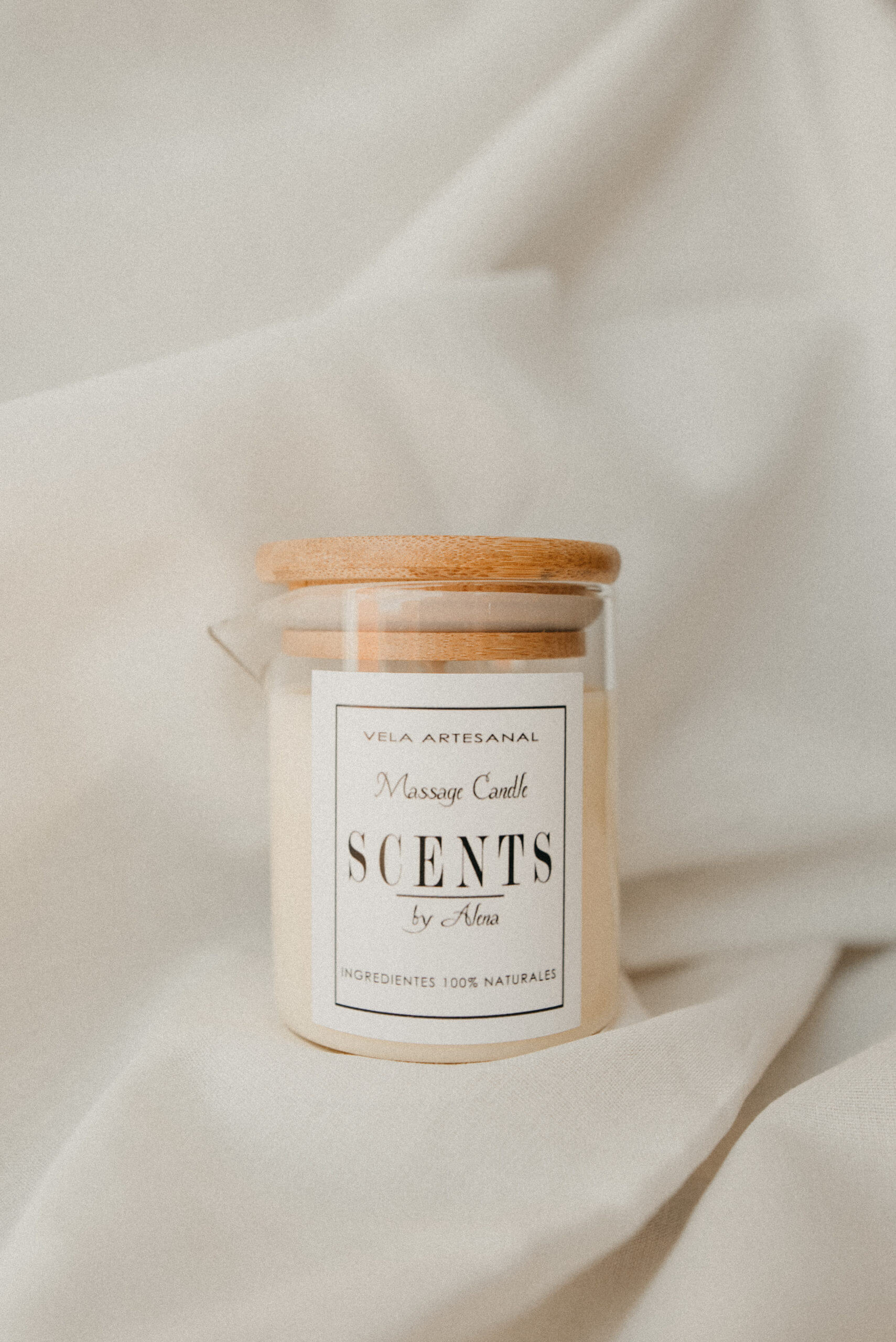 Vela de masaje 150 ml de cera de soja eco, mateca de karité, aceite de pepita de uva y composición de aceites esenciales relajante.
