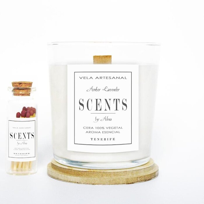 La tapa de la vela esta hecha a mano. Viene acompañada con una botellita de cerillas que le dan un toque particular y elegante.