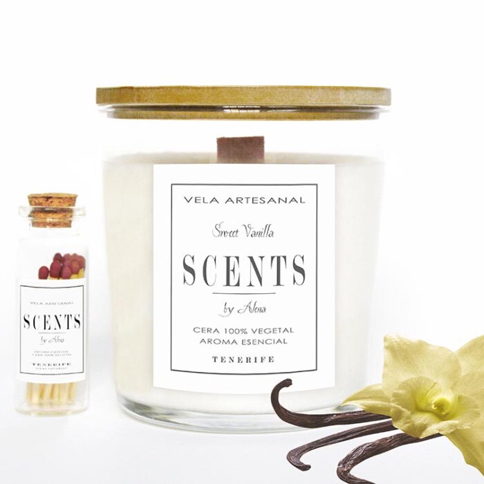 La tapa de la vela esta hecha a mano. Viene acompañada con una botellita de cerillas que le dan un toque particular y elegante.