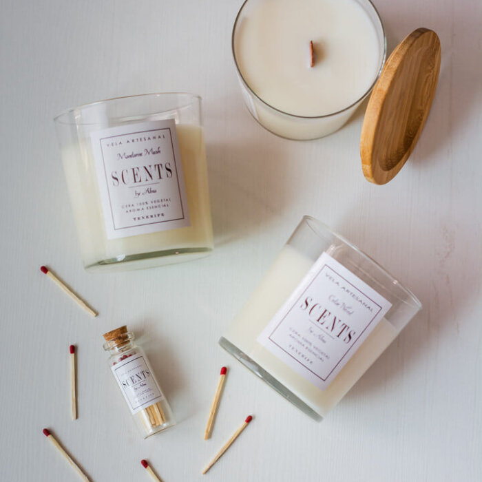 Viene acompañada con una botellita de cerillas que le dan un toque particular y elegante.