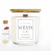 Vela grande aromática de cera de soja en recipiente de cristal con tapa chapada en pino.