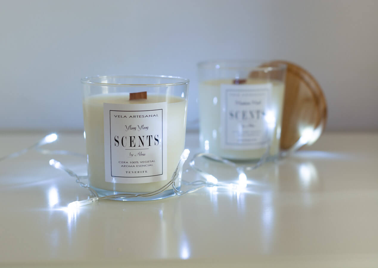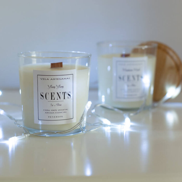 Vela grande en recipiente de cristal con tapa chapado en pino (la tapa esta hecha a mano en Tenerife).