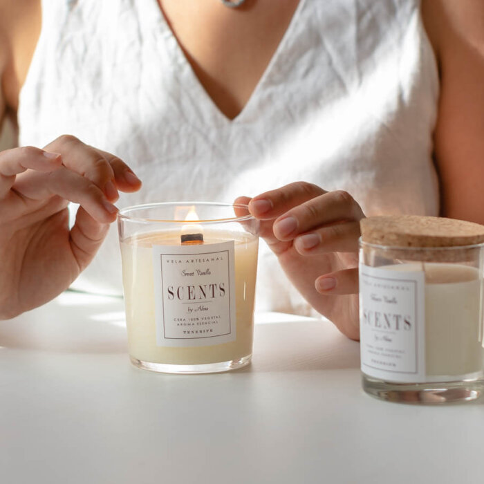 Vela grande aromática de cera de soja en recipiente de cristal con tapa chapada en pino.