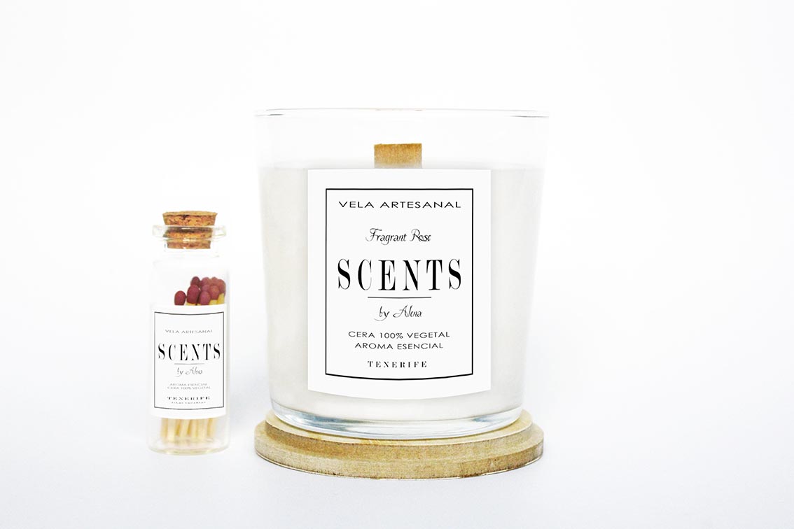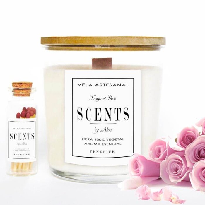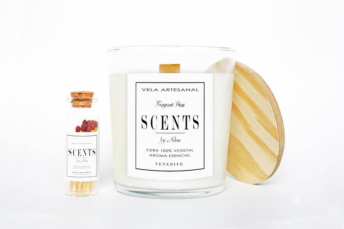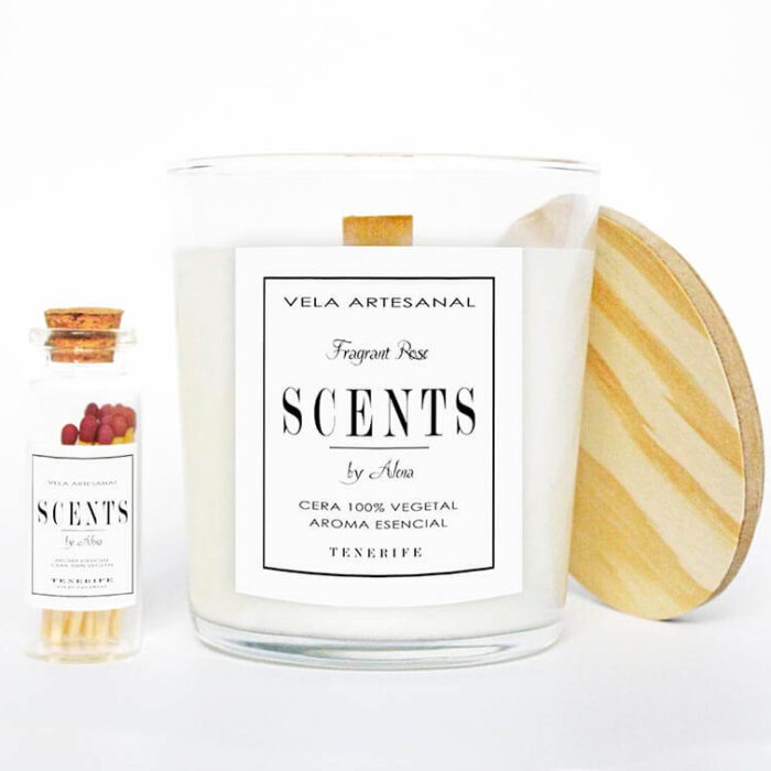 La tapa de la vela esta hecha a mano. Viene acompañada con una botellita de cerillas que le dan un toque particular y elegante.