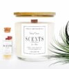 Vela grande aromática de cera de soja en recipiente de cristal con tapa chapada en pino.