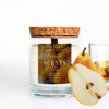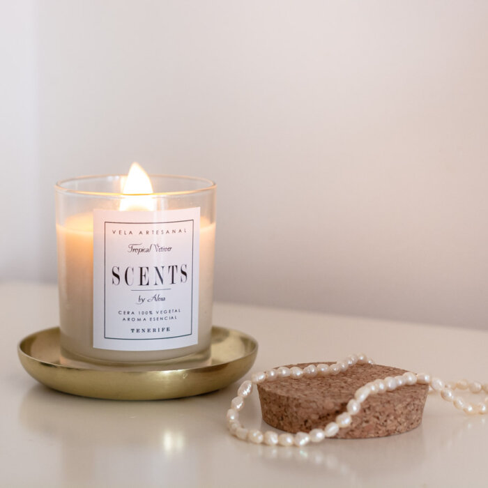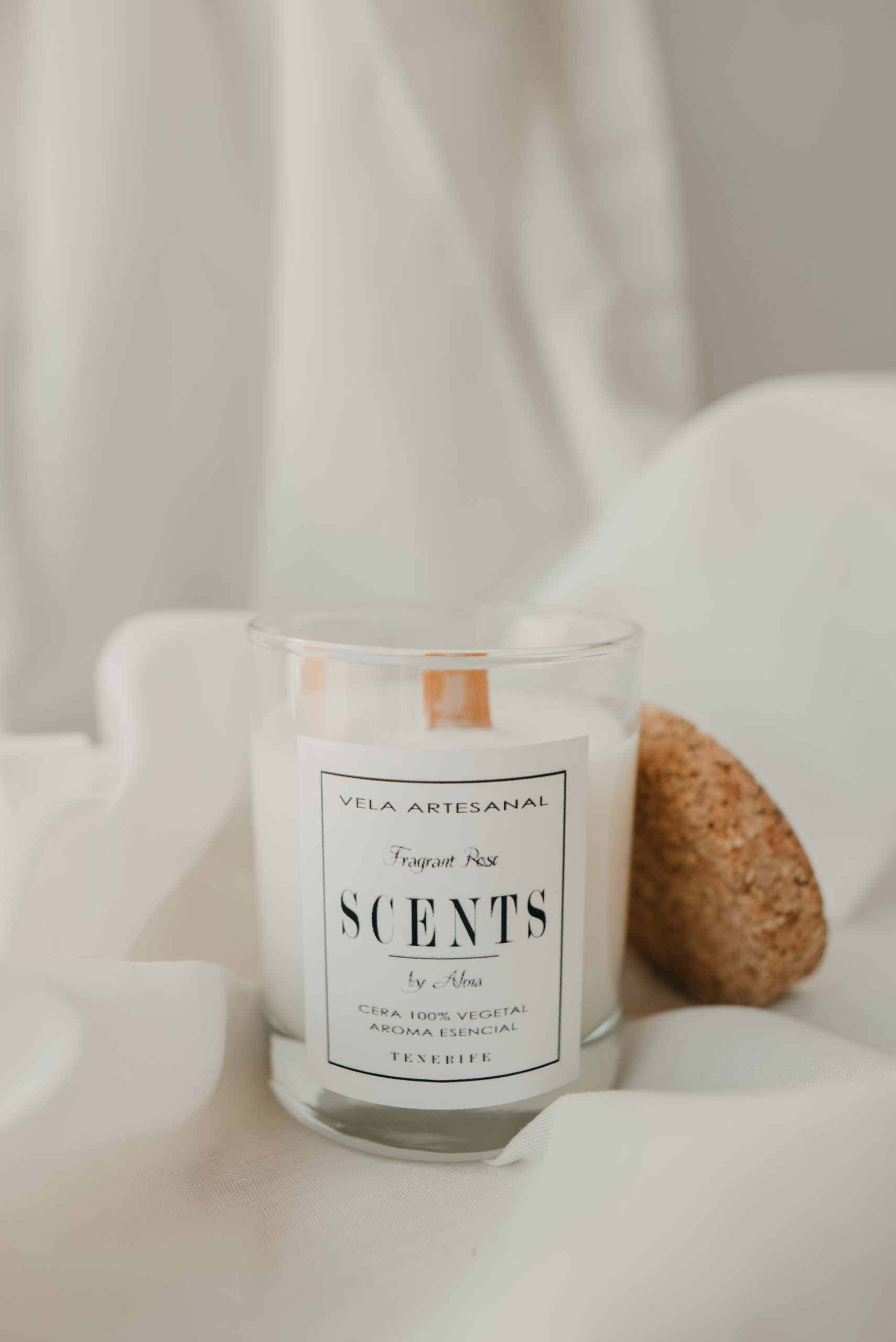 Vela mediana aromática de cera de soja en recipiente de cristal con tapa de corcho.
