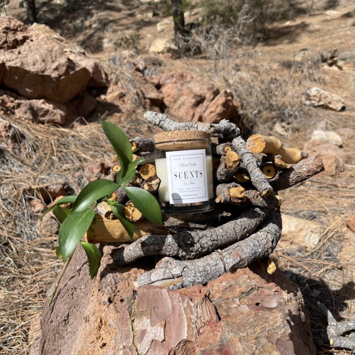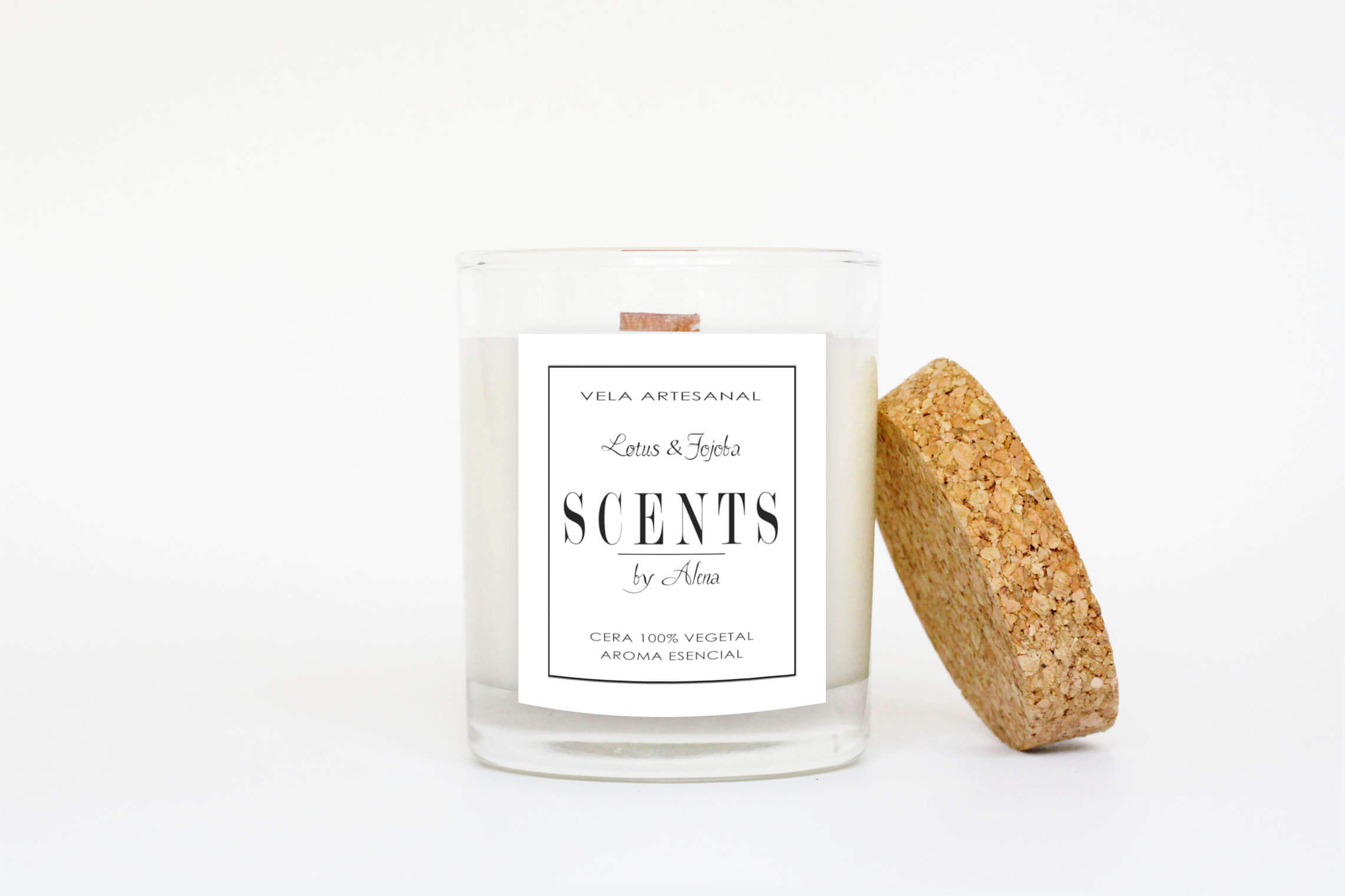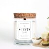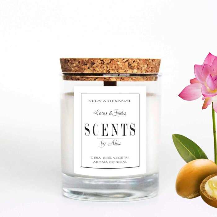 Vela mediana aromática de cera de soja en recipiente de cristal con tapa de corcho.