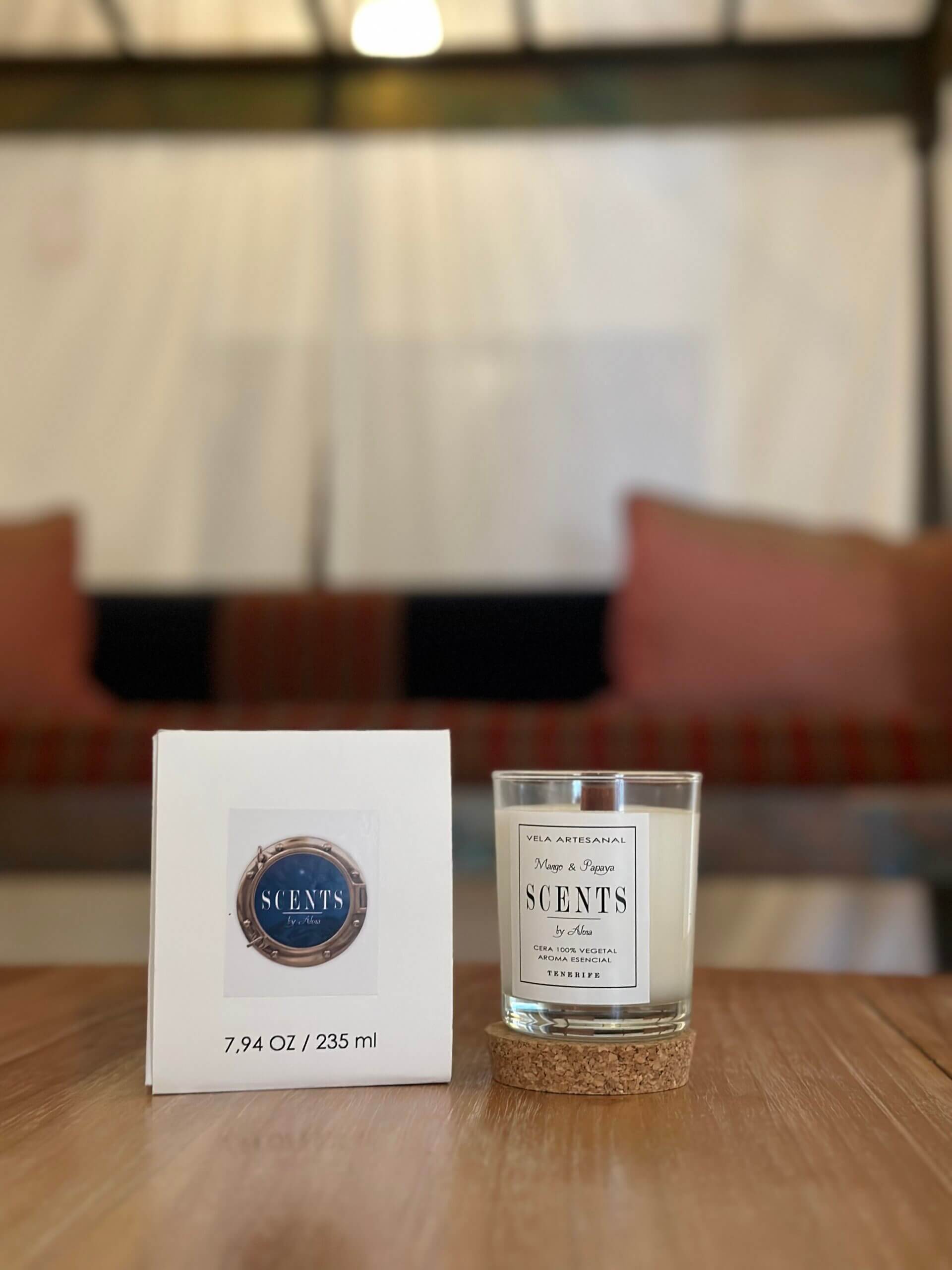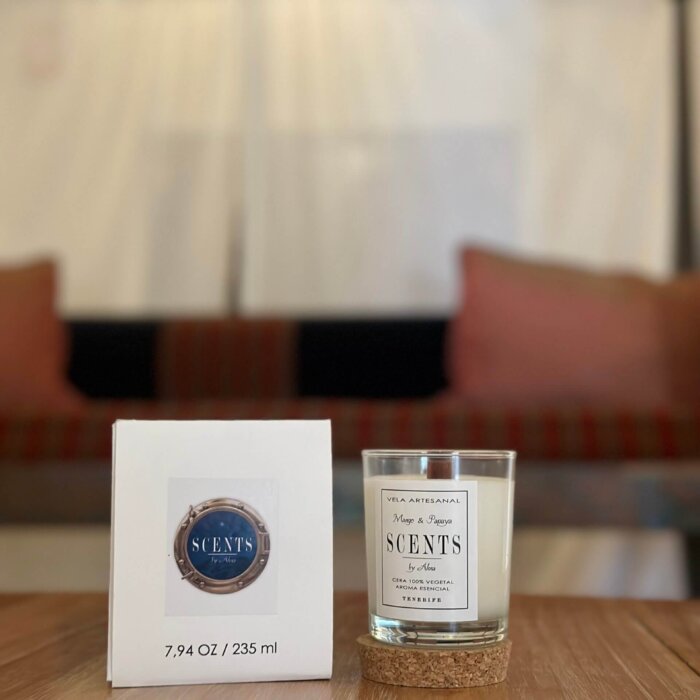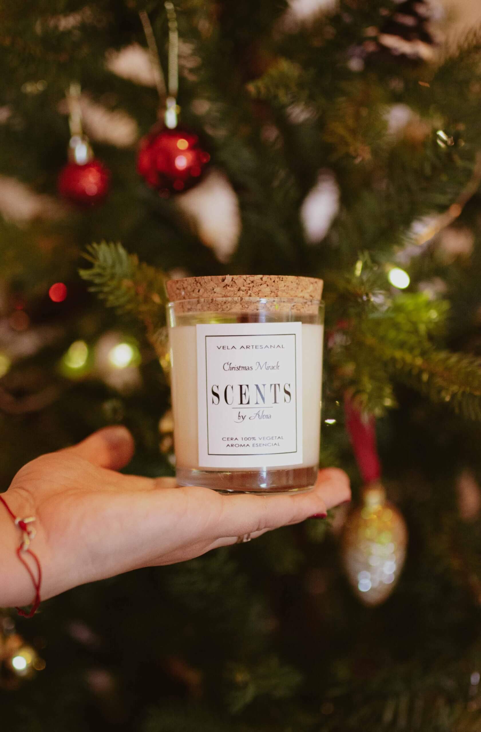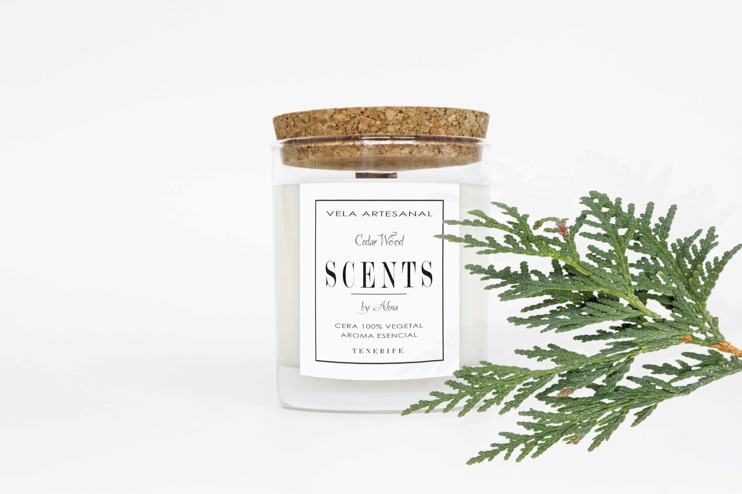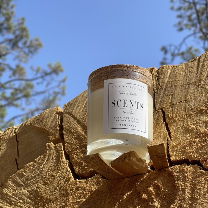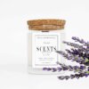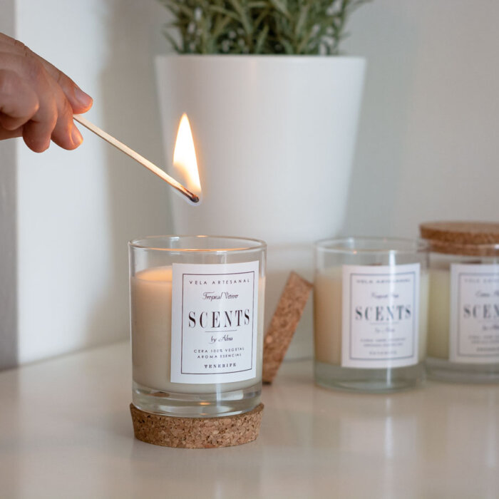 Vela mediana aromática de cera de soja en recipiente de cristal con tapa de corcho.