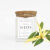 Vela mediana aromática de cera de soja en recipiente de cristal con tapa de corcho.