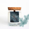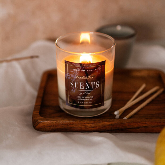 Vela mediana aromática de cera de soja en recipiente de cristal con tapa de corcho.