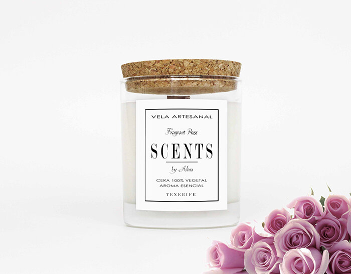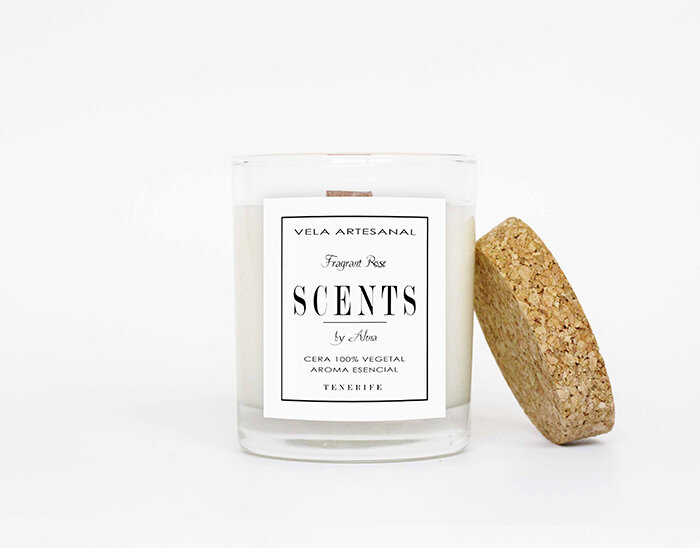 Vela mediana aromática de cera de soja en recipiente de cristal con tapa de corcho.