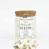 Vela mediana de cera de soja en recipiente de cristal con tapa de corcho.