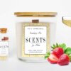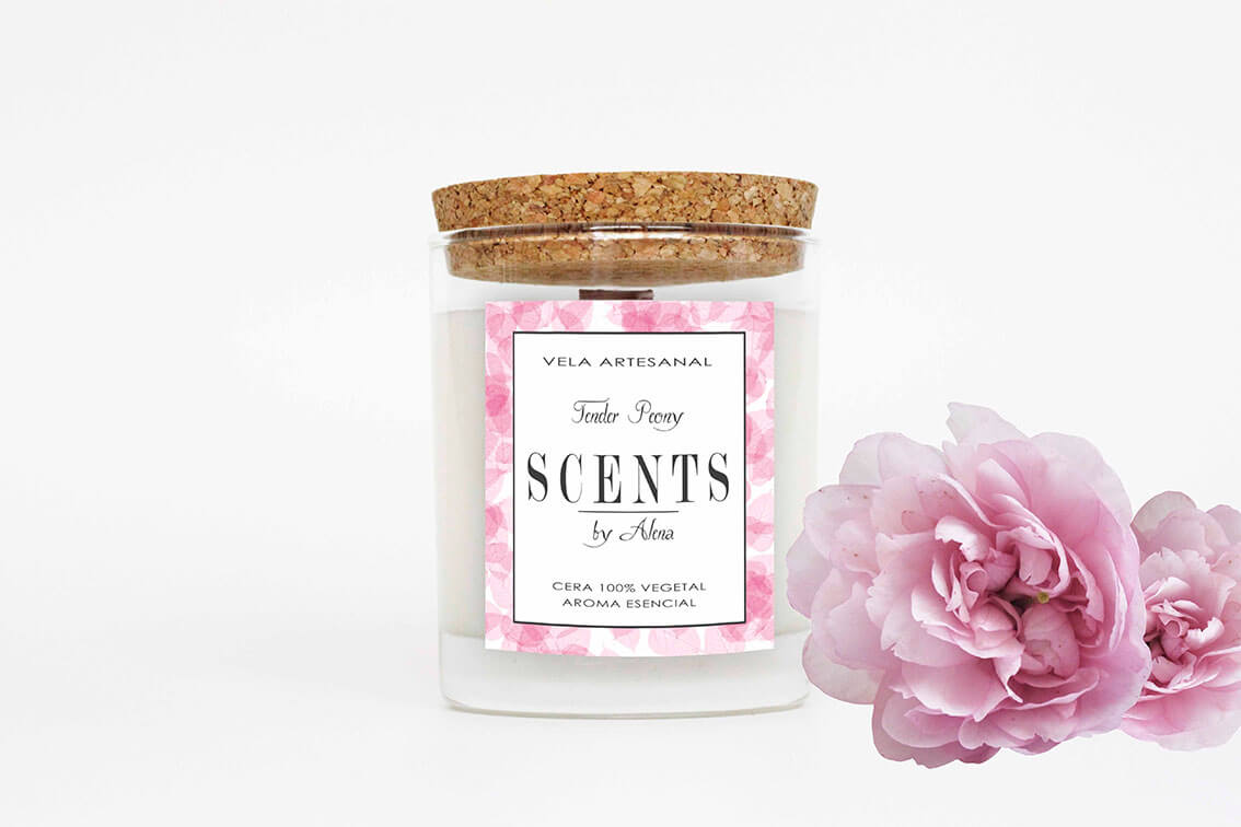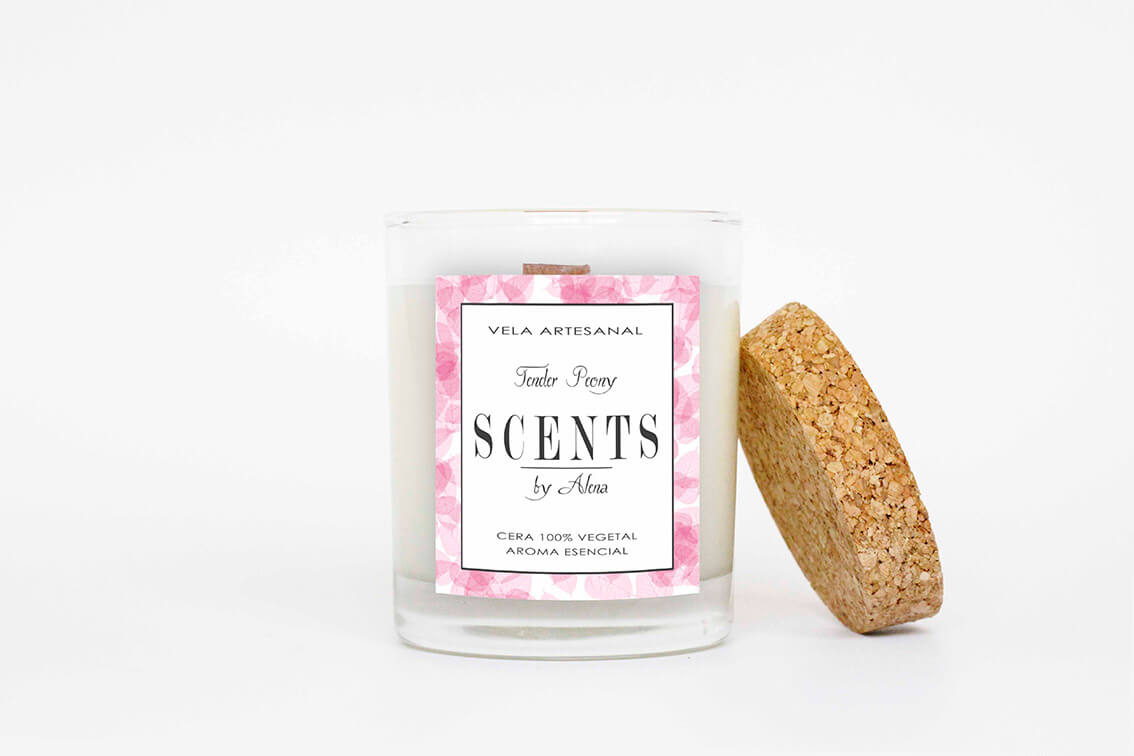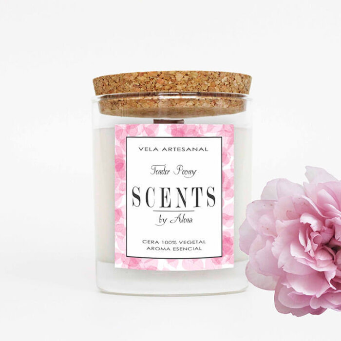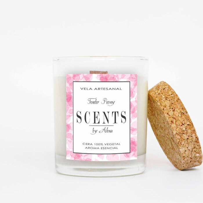Vela mediana aromática de cera de soja en recipiente de cristal con tapa de corcho.