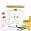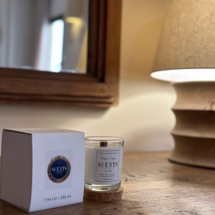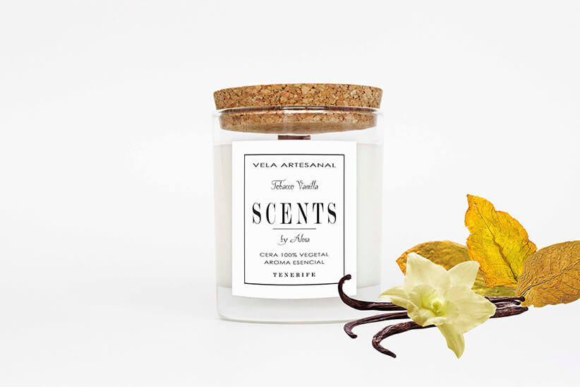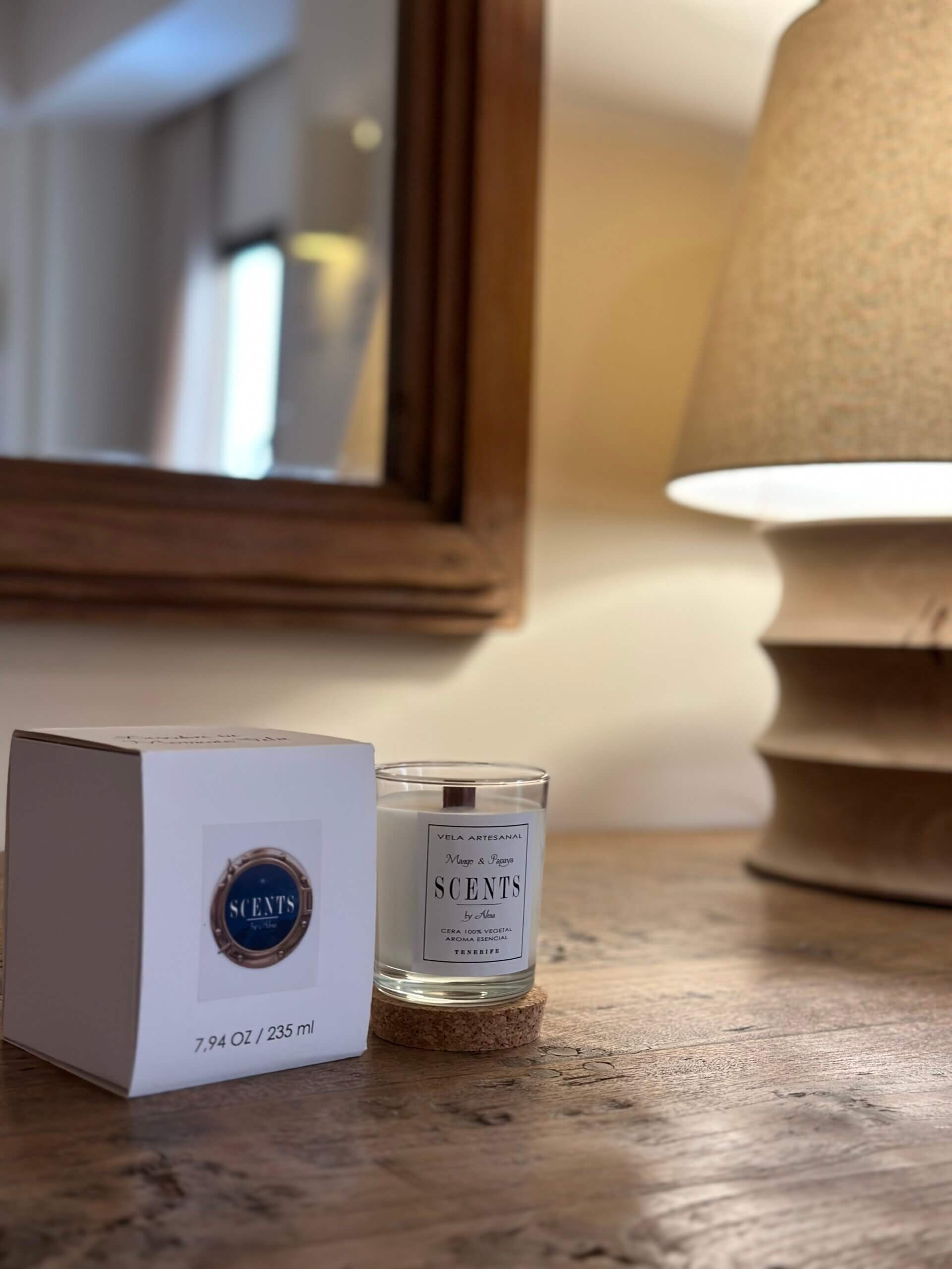 Vela mediana aromática de cera de soja en recipiente de cristal con tapa de corcho.