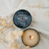 Vela pequeña aromática de cera de soja en recipiente negro de alumunio con tapa.